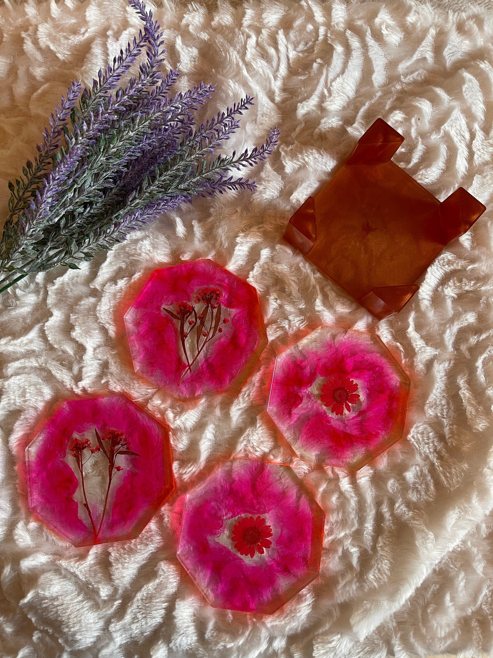 Vier glänzende Untersetzer mit Halter aus hochwertigem Epoxidharz – das perfekte Duo für deinen Couchtisch! Mit ihrer glatten, robusten Oberfläche schützen sie deine Möbel zuverlässig vor Flecken und Kratzern. Das moderne Design passt zu jedem Einrichtungsstil und macht deine Getränke zum echten Hingucker. Praktisch, langlebig und einfach zu reinigen – deine neuen Lieblingsteile für gemütliche Stunden!